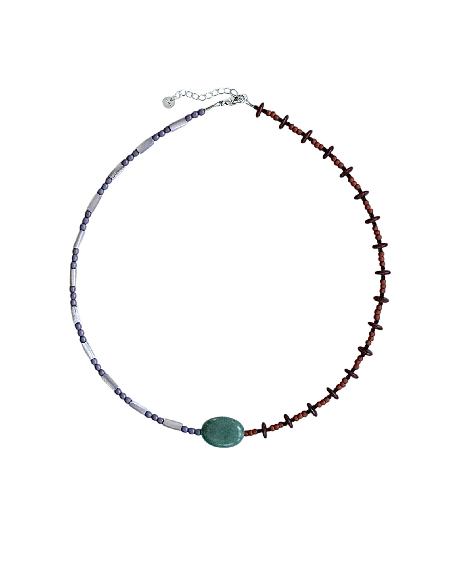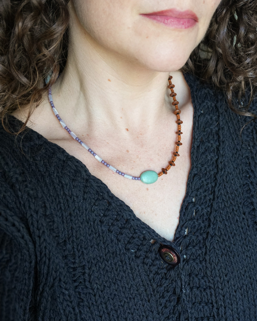 Lavender mother of pearl and glass seed beads, a green jasper centerpiece, and brown and black glass beads.