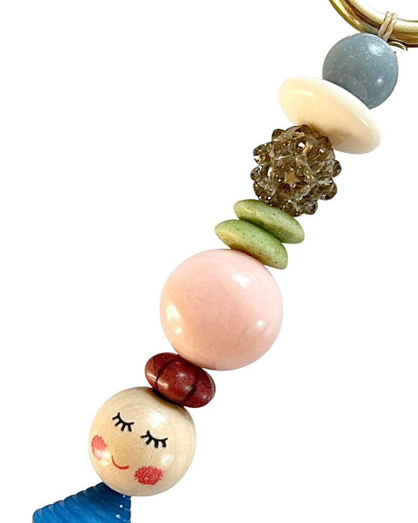 Each Stack is thoughtfully composed by hand using a mix of vintage glass, acrylic, wood, ceramic, and stone beads. The shapes, tones, and textures are intentionally balanced to create a small sculpture for your tote bag, purse, or keyring!