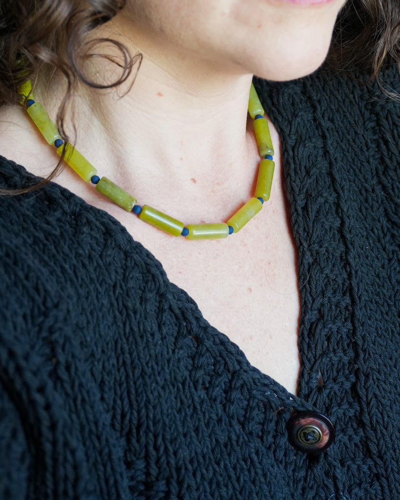 Vintage jade paired with velvet blueberry glass spacer beads. Due to variations in the stone, each piece is unique and may differ slightly from pictured.