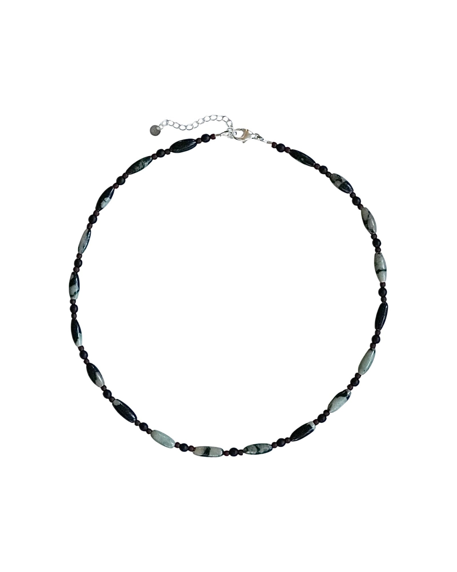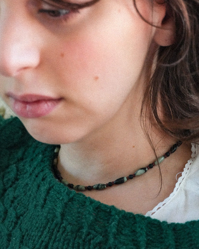 Vintage black and moss green jasper with black and brown glass beads. Due to the variations in the gemstone, each piece is unique and may differ slightly from pictures.
