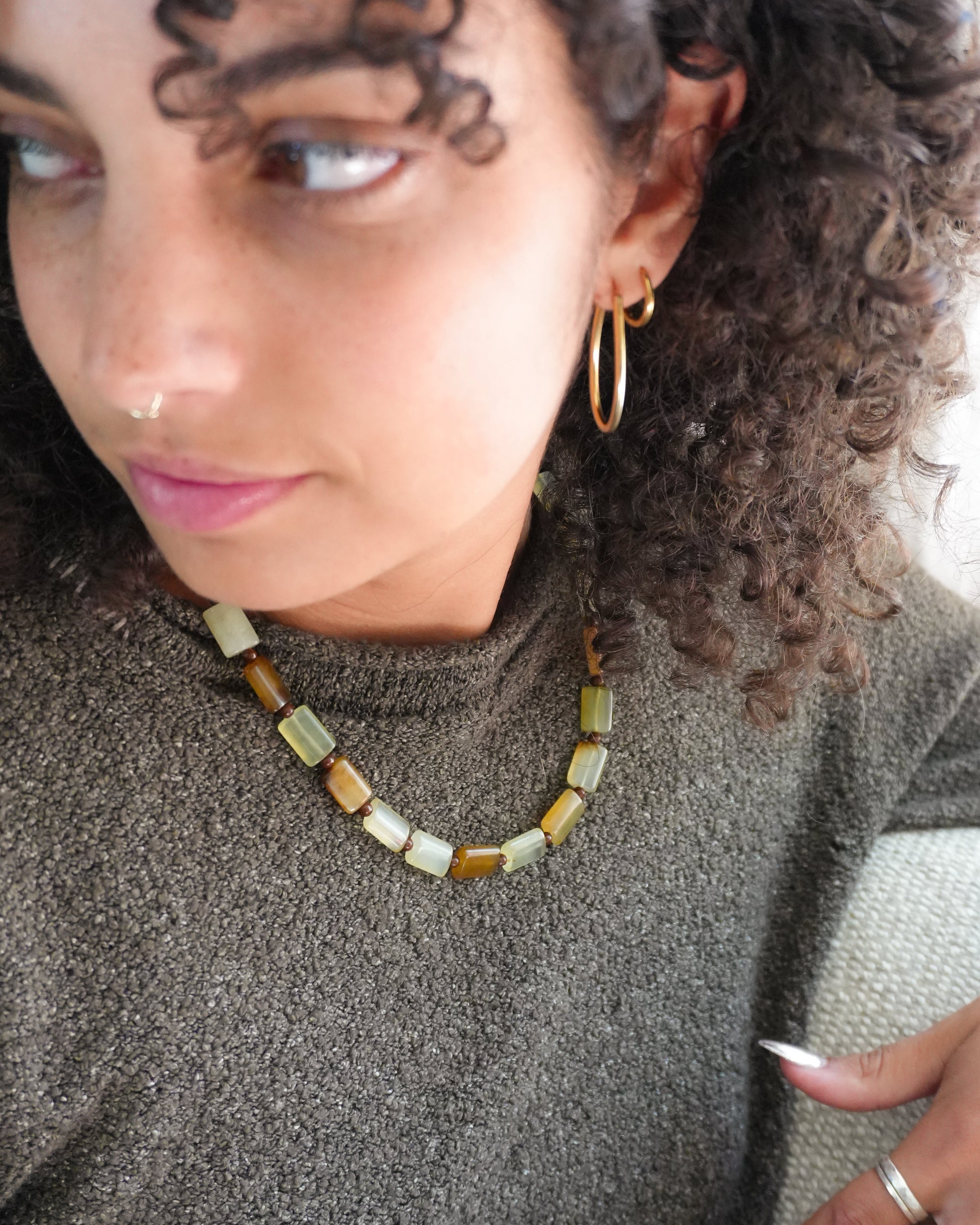 Multi-toned antique jade paired with vintage brown glass spacer beads. Due to the natural variations of the stone, each piece is unique and may differ from the photos.