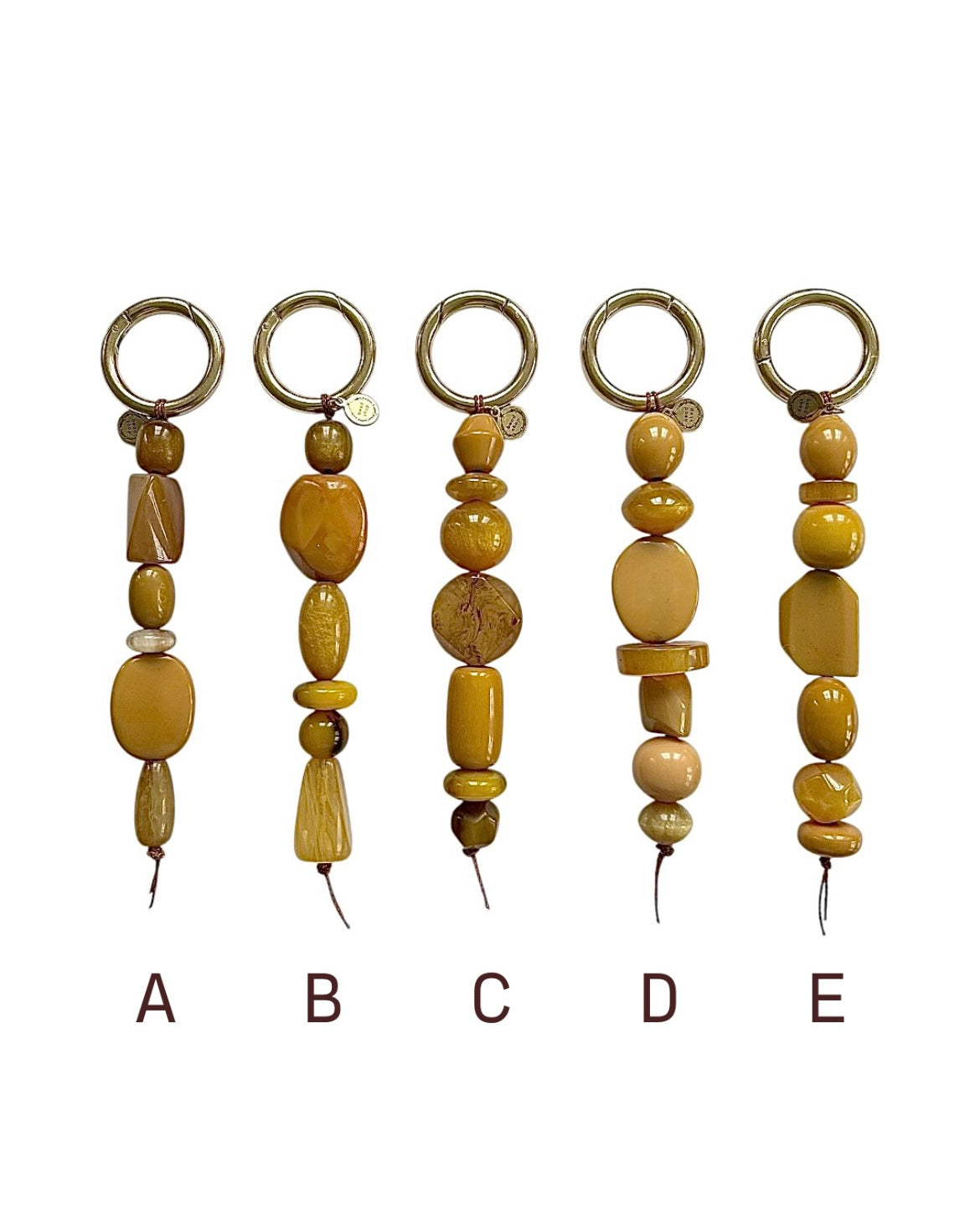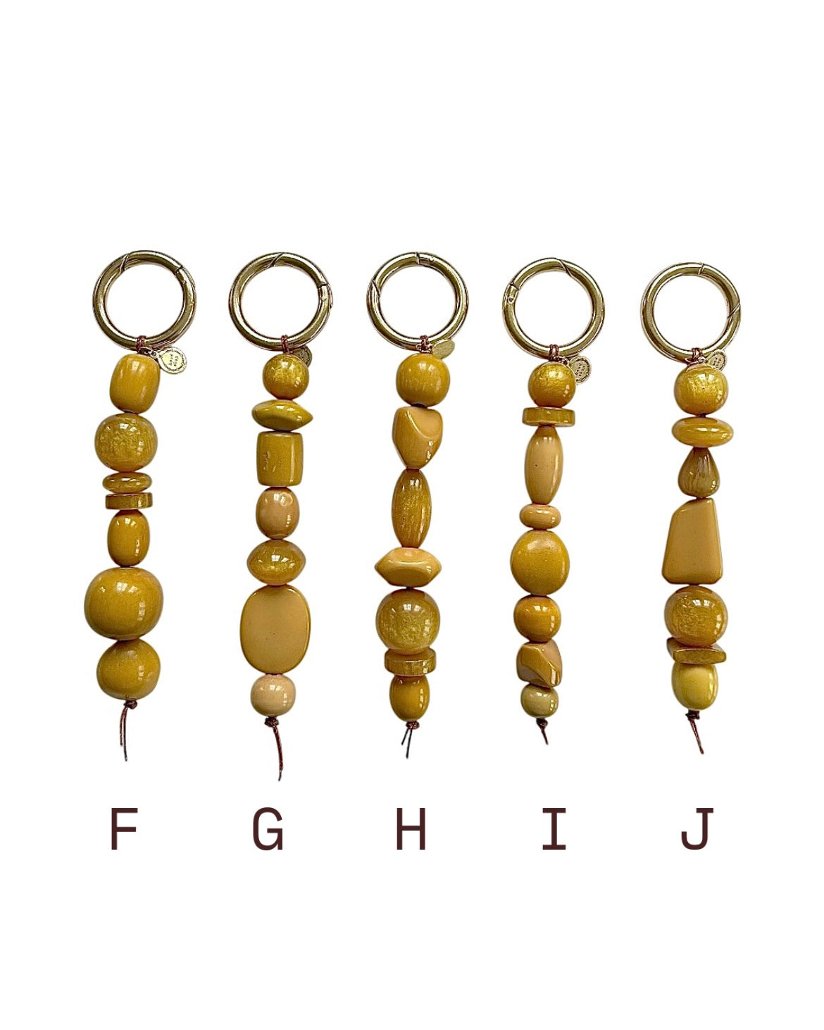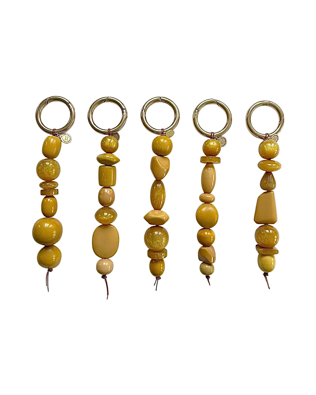 Each Honey Stack is thoughtfully composed by hand using a mix of deep yellow vintage resin beads. The shapes, tones, and textures are intentionally balanced to create a small sculpture for your tote bag, purse, or keyring!