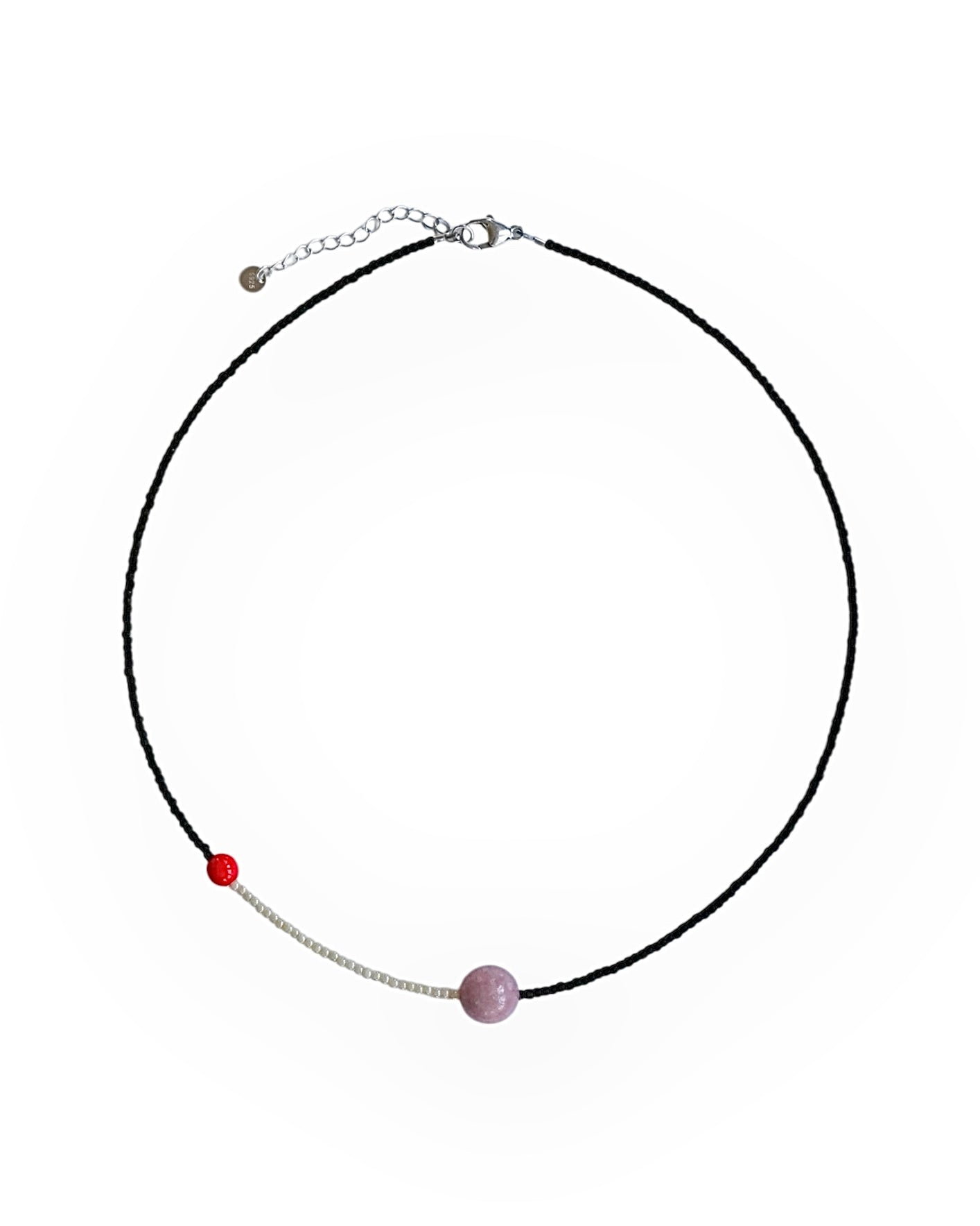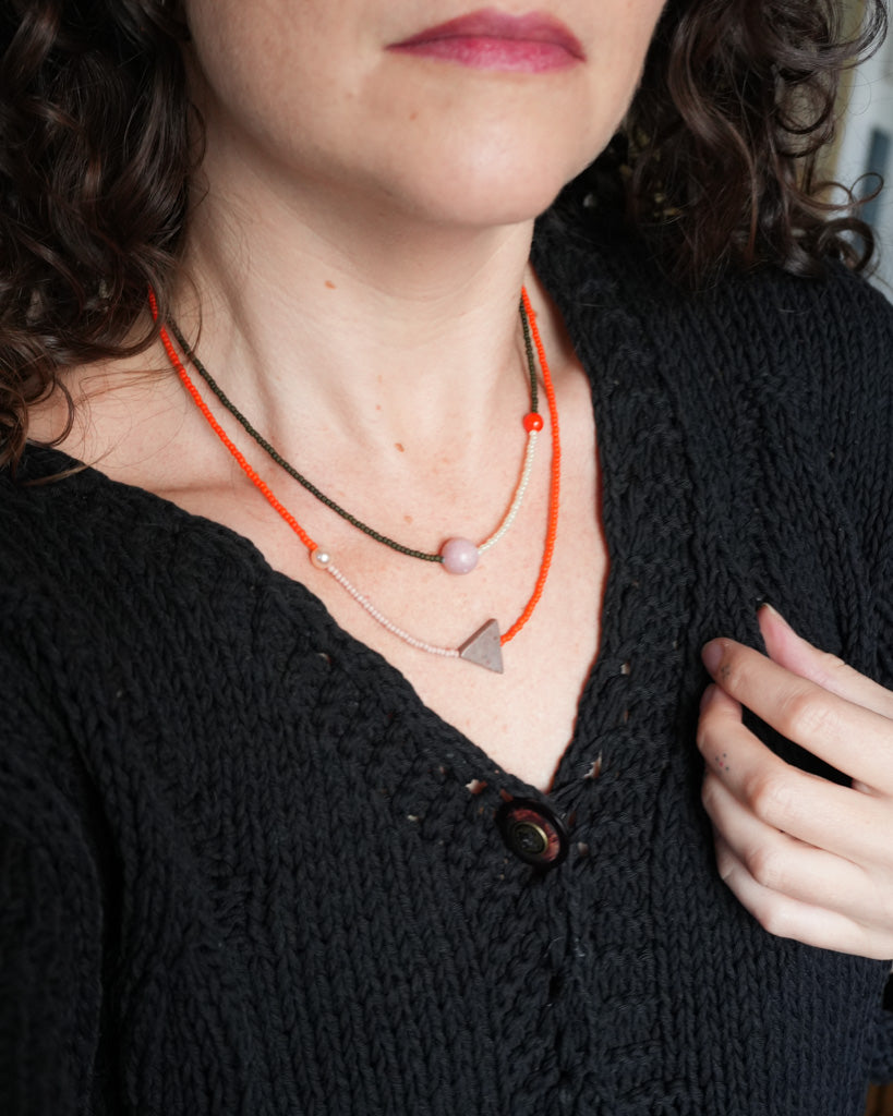 Dark olive and cream seed beads, pink opal centerpiece, and bright red Czech glass.