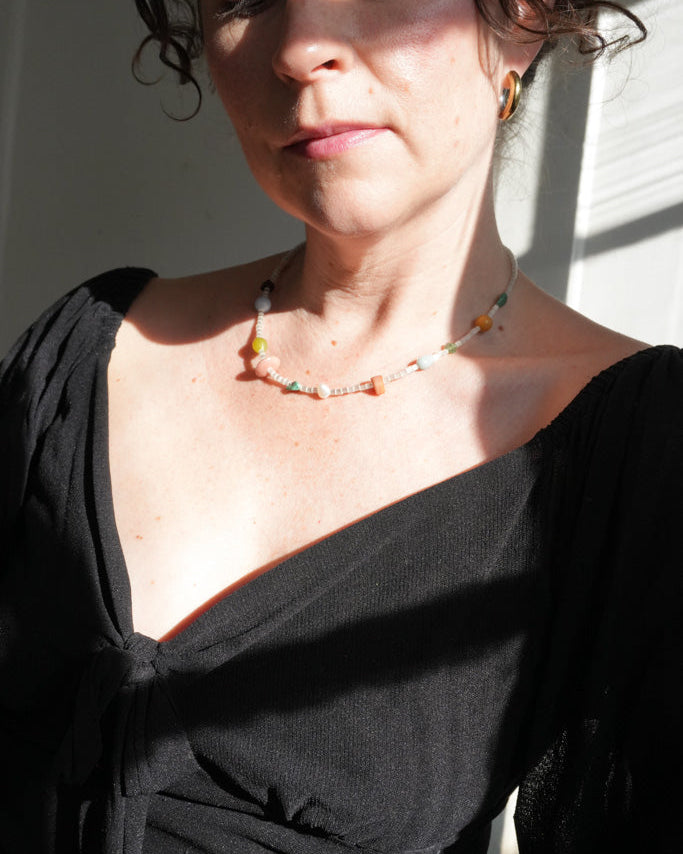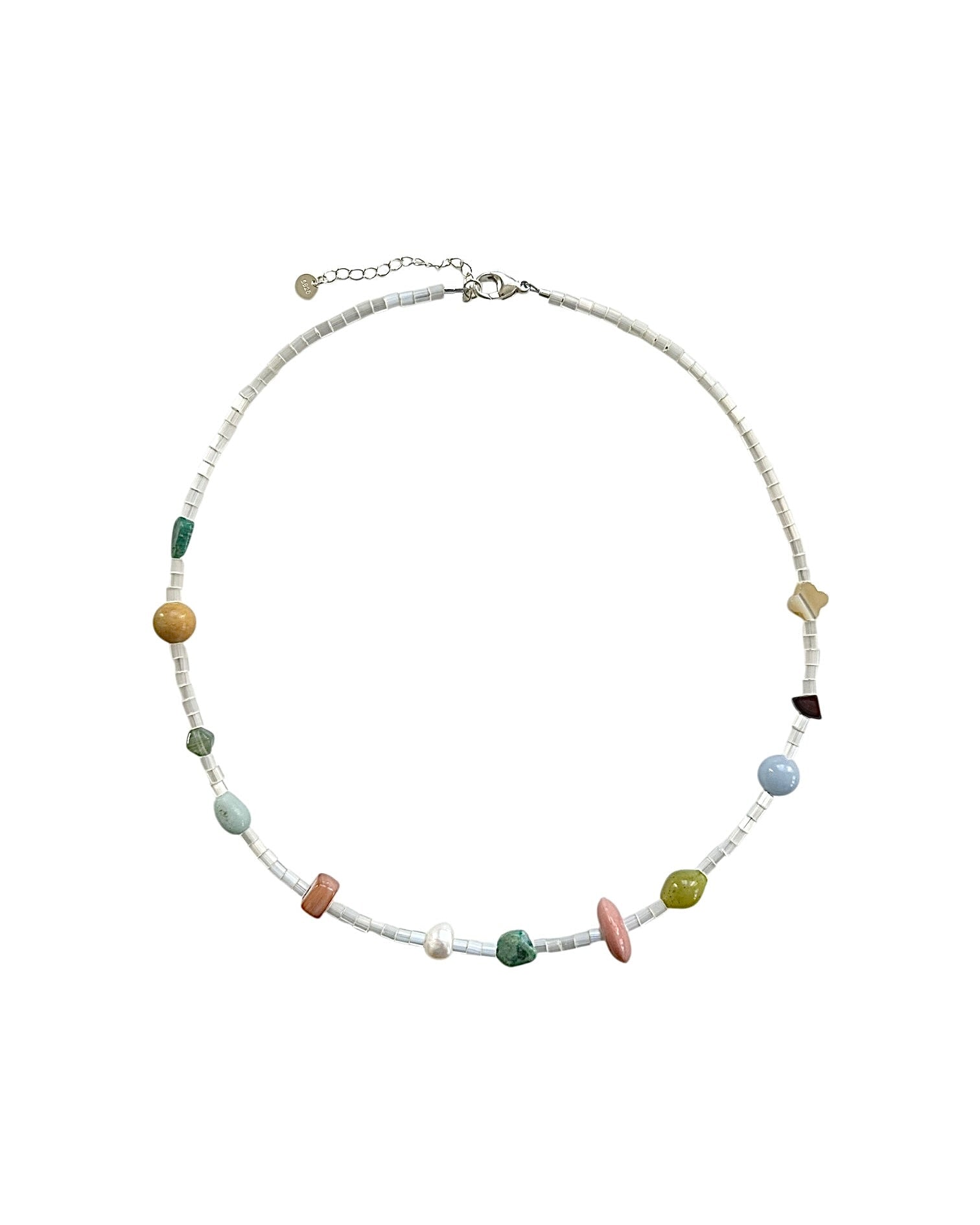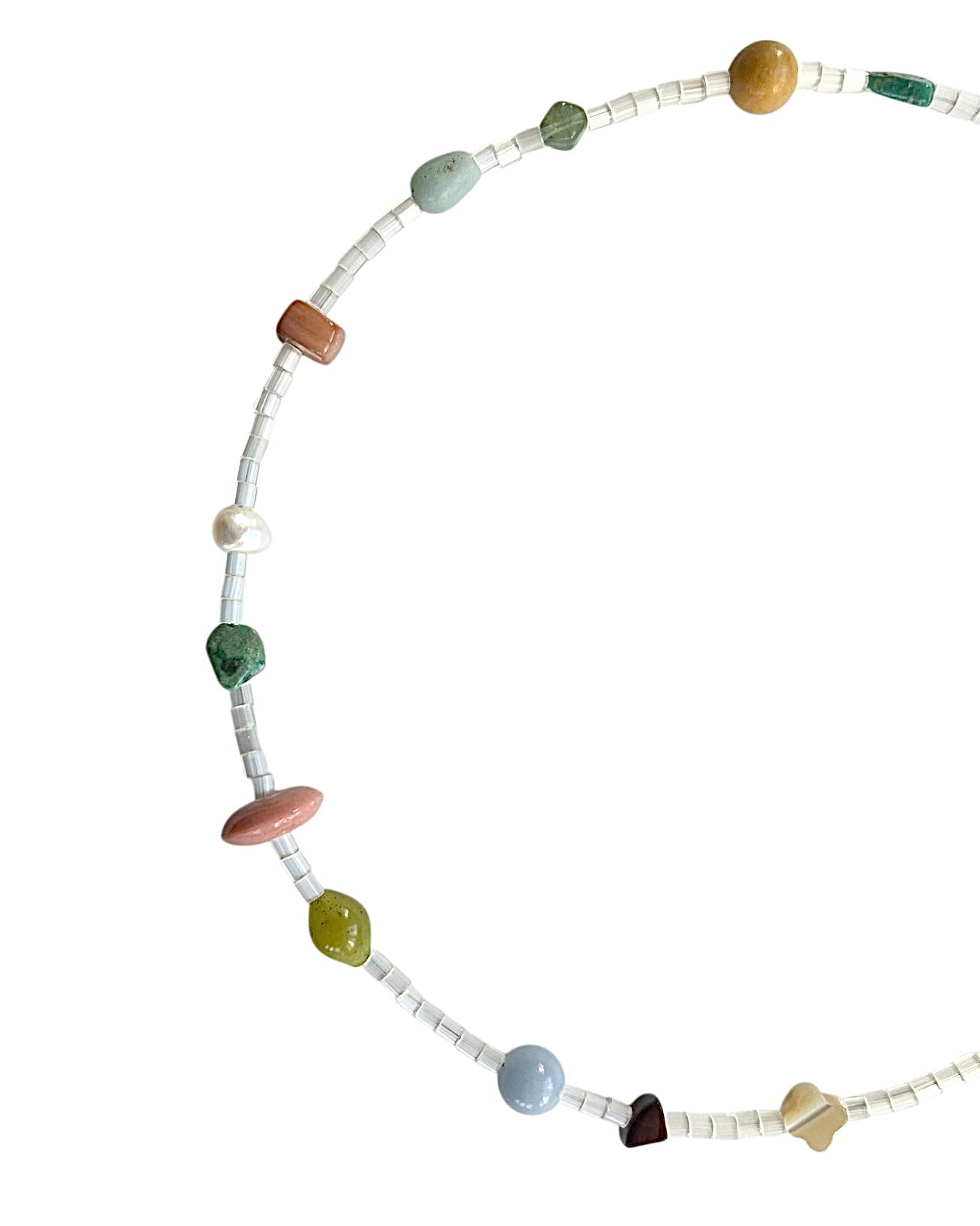 Glass and mixed gemstones, including turquoise, yellow jade, amazonite, mother of pearl, freshwater pearl, jade, and angelite.